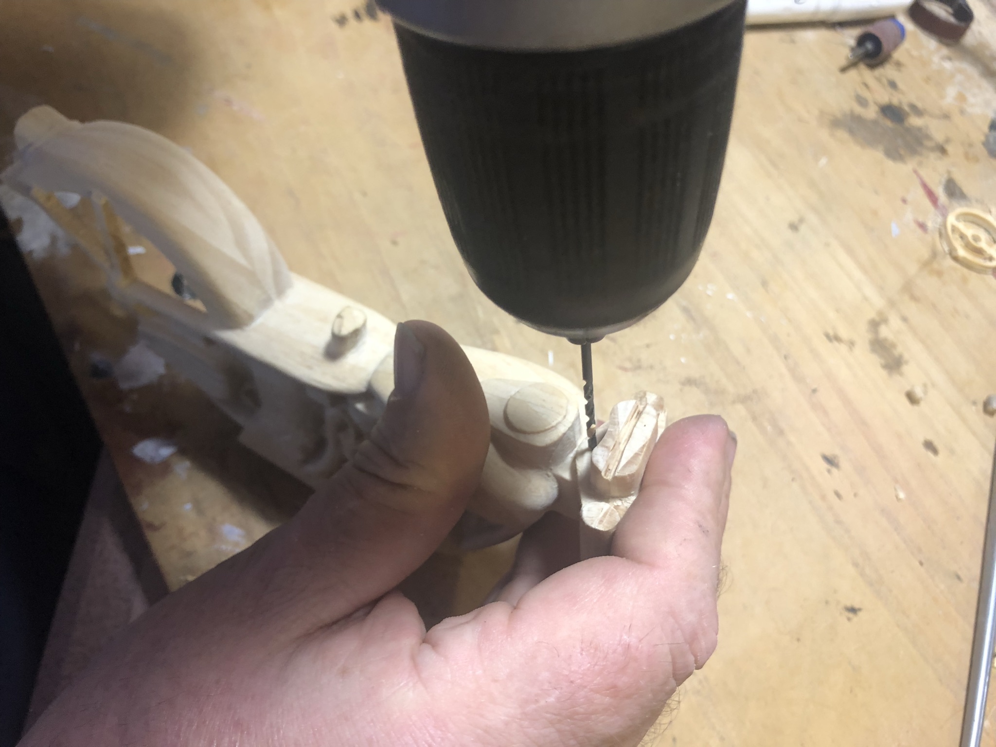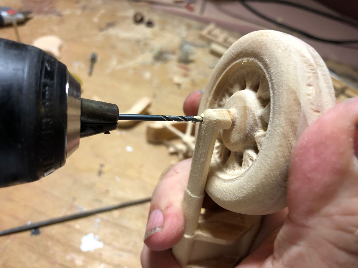 Using a 1/16 inch drill bit, holes were drilled for the axle through the tires and fork for the front, and the tire and motorcycle body on the back.