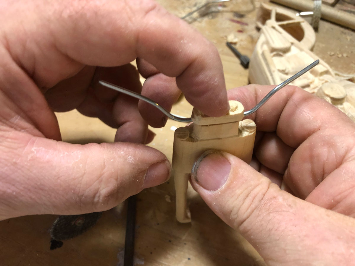 The handlebar, made from a coat hanger, fits into the groove under the top of the fork cap.