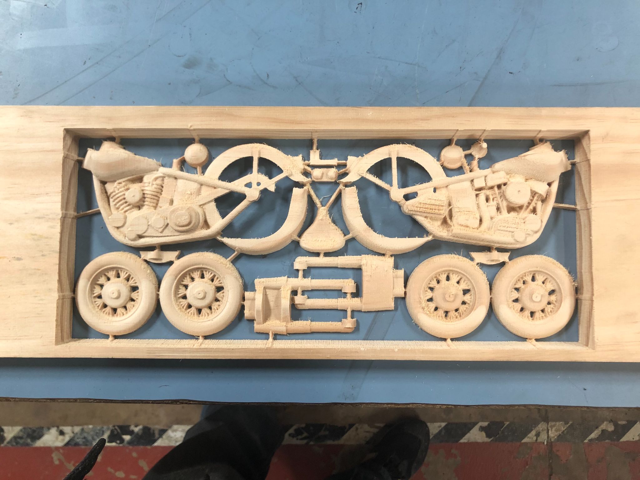 Then, the pieces were glued together. The two halves of the motorcycle body, the forks, wheels, and the front fender parts. It was much easier to sand these parts after they were glued together.