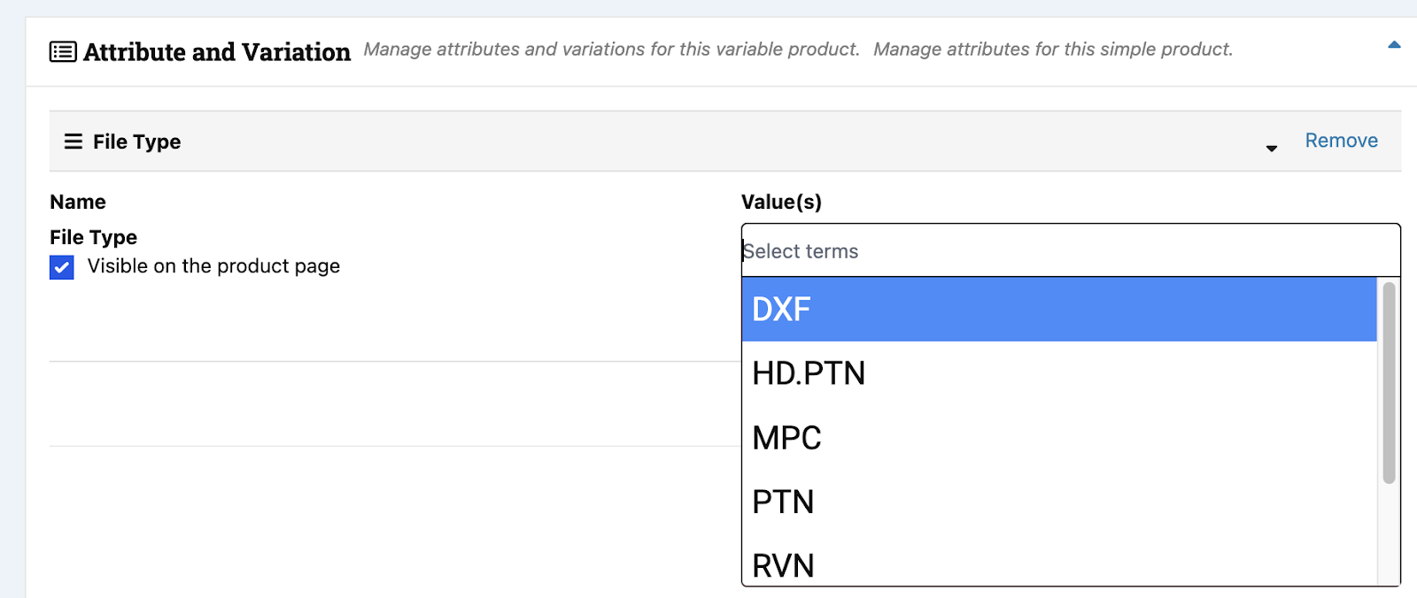 1. Attributes and Variations: This is where you set the file type for your upload. Click on “Select items” under Value(s) and select your filetype.