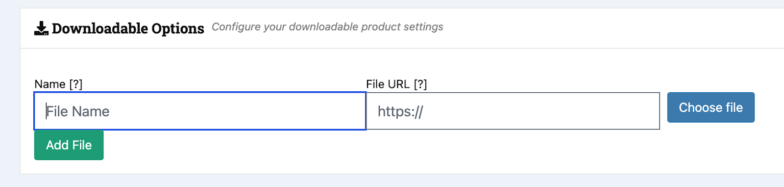 1. Downloadable Options: To add your downloadable file, click on the green Add File bottom then click on the Choose file button to upload your file.
