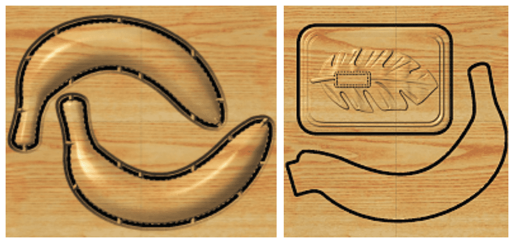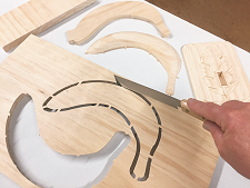 Separate the parts from the boards. Sand off tabs and all undesirable toolmarks from the base. The tabs on the banana sections will be sanded after glue-up.