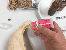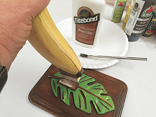 Screw in the cup hook, then glue the banana into the slot of the base. I used some CA glue to tack in place while the wood glue dried. You can also use a couple pin-nails from the bottom, if you like.