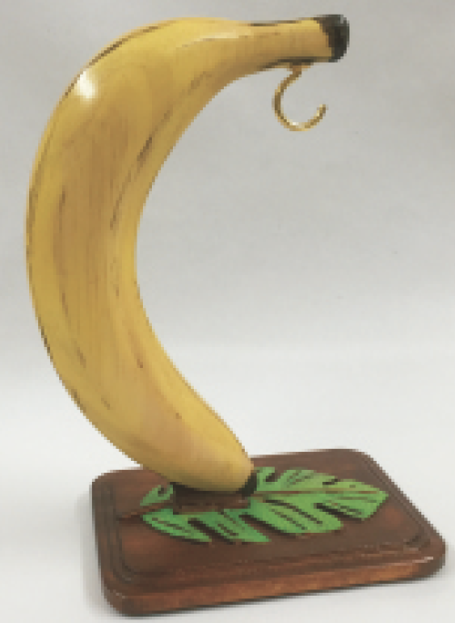 The holder’s hooked arc is an oversized wooden banana connected to the base with mortise and tenon construction. The base features a relief carve of a banana leaf for a little extra whimsy!