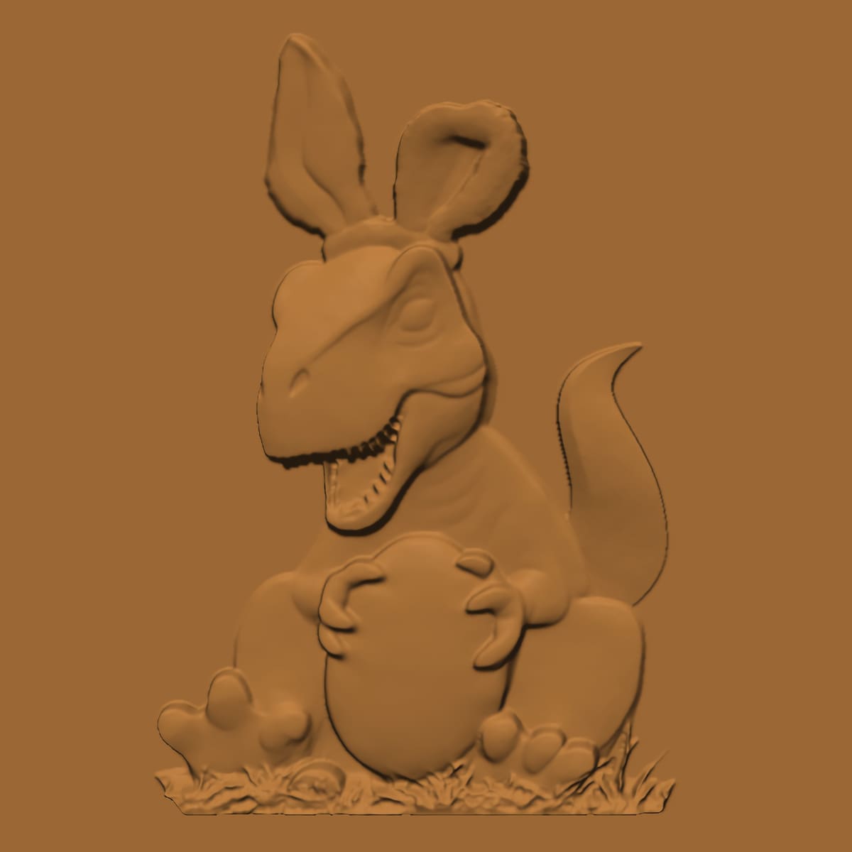 Easter Tyrannosaurus Rex wearing bunny ears holding an Easter egg.