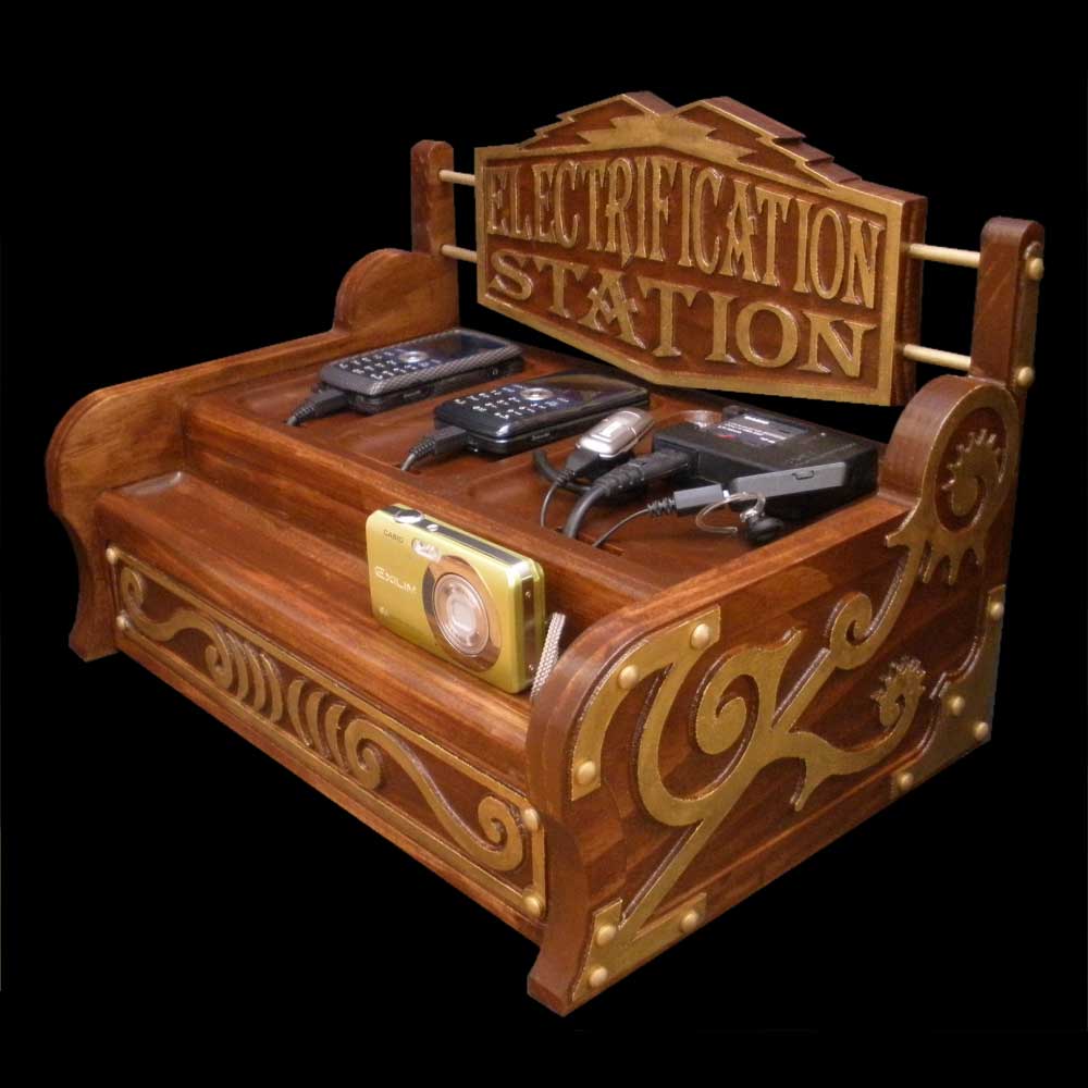 Hide the clutter and make a home for your cell phone, ear piece and camera charging wires with the Electrification Station! This rather unique design was inspired by “Victorian Science Fiction” better known as “Steam Punk”. I imagine this is similar to what the author Jules Verne may have had in his office if rechargeable devices were as commonplace back then as they are today!