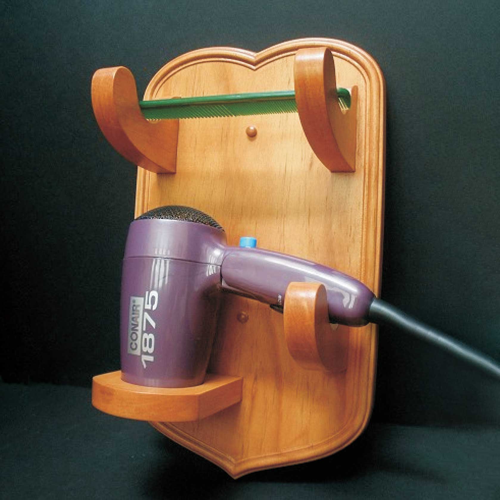 This project provides a convenient and attractive wall mounted organizer for two of your main hair care products. It holds a hair dryer and comb/brush, or curling iron or hair straightener (a cooled curling iron or hair straightener, of course!)