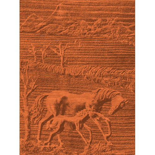 This pattern has a depth of .698 so the user may apply as needed. This is the same scene as “Horse and Colt Scene-AB-001” except the edge will not appear raised within a feather of the pattern.