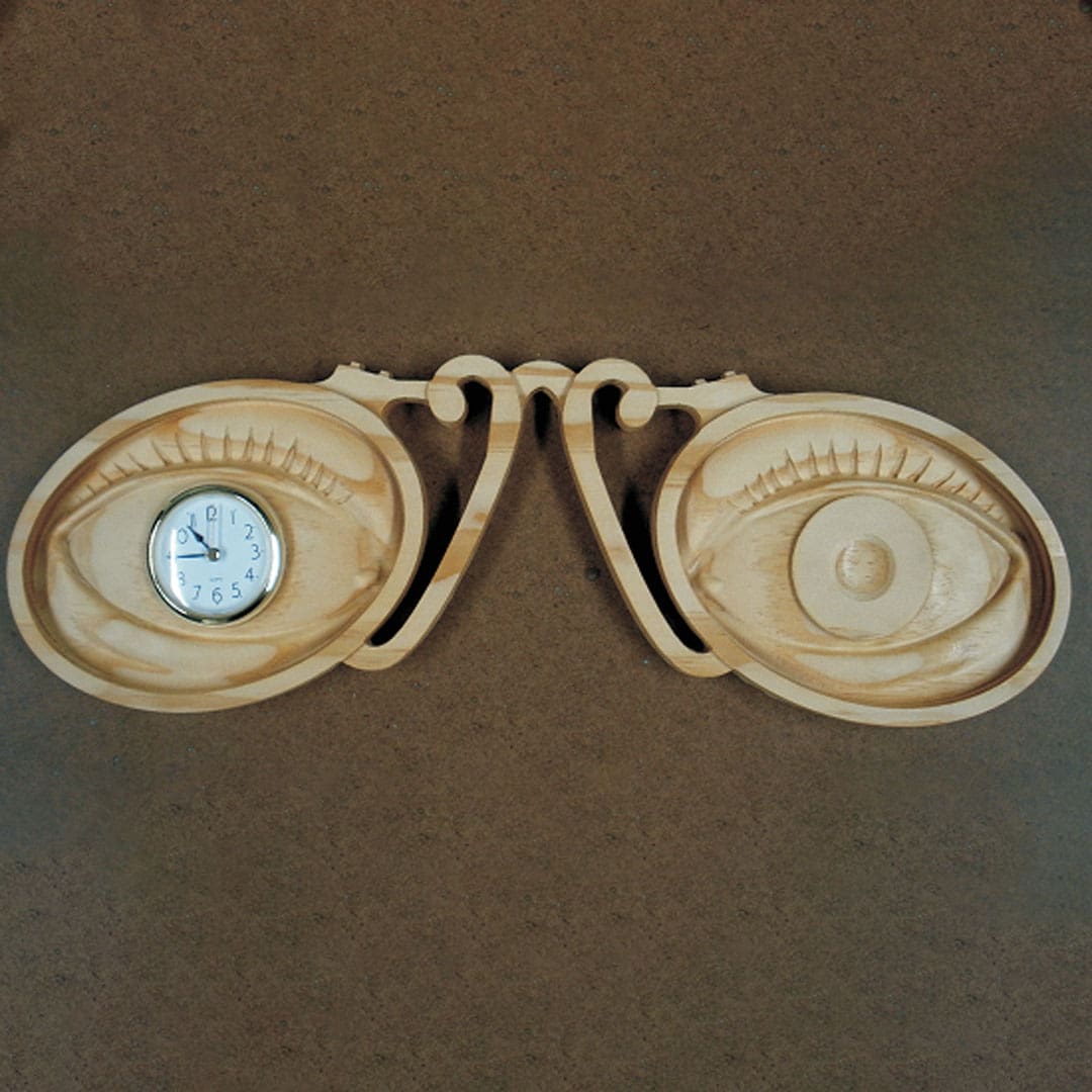 This project is for all you “clock watchers” out there! Vintage style eyeglasses and eyes for one (or even two) clocks, will watch over the time for you! You’ll notice in the MPC project file that one eye iris is cut out for mounting 2.5" round clock insert, by default. However, you can apply a Cut Path to the other iris and mount a second clock for monitoring the time in a different Time Zone, if desired! All components are arranged, carved, and cut out from a single board.
