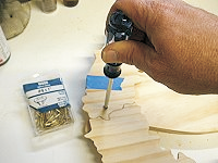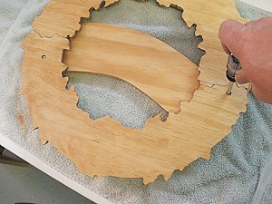 Turn the wreath over and drill a couple countersunk holes from the back side for the #6 wood screws. Be careful to position the holes over the thicker parts of the banner ends so the screws won’t poke through the front side.