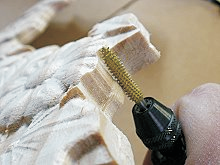 Use a Dremel-type tool to sand off the tabs and sand all the components to remove any fuzzies and undesirable tool marks. I use various Dremel bits as well as 3M Radial Bristle Discs from www.mcmaster.com to safely remove fuzzies from carvings without loss of detail.
