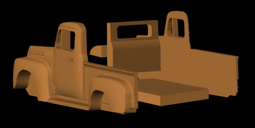 I was searching for a fun Christmas project to make this year with my CarveWright when a coworker suggested, “oh, make one of those red christmas trucks”.  I looked up what she was talking about and quickly saw an overwhelming amount of these old red pickup truck decorations. This is definitely a popular theme, and with good reason.  It looks great!  An old 1950’s pickup truck hauling Christmas trees with all the retro nostalgia of a Norman Rockwell painting. I had actually carved a 1950 Ford pickup truck many years ago from an STL model, so I decided to revisit it.