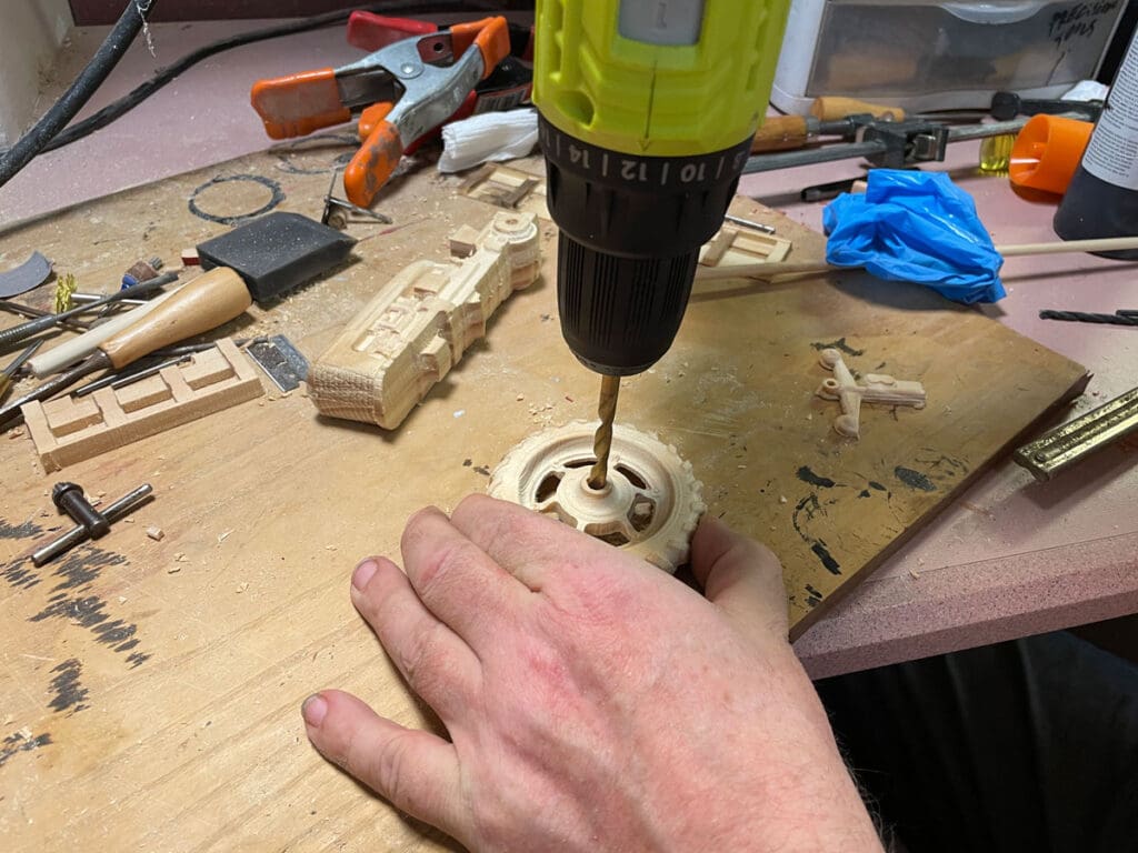 The parts were carefully removed using a sharp chisel and then sanded to get them cleaned up. Much of this assembly uses dowels to go together and we needed to drill some holes.