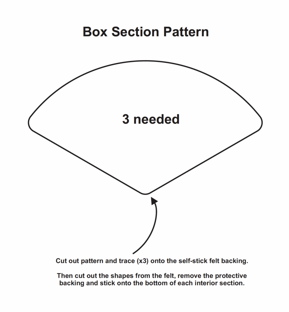 Apply self-stick bumper pads or cork to the underside of the box to protect surfaces. I included a pattern (page 6) for cutting out self-stick felt to line the interior of the box section bottoms, if desired (I left mine natural wood).